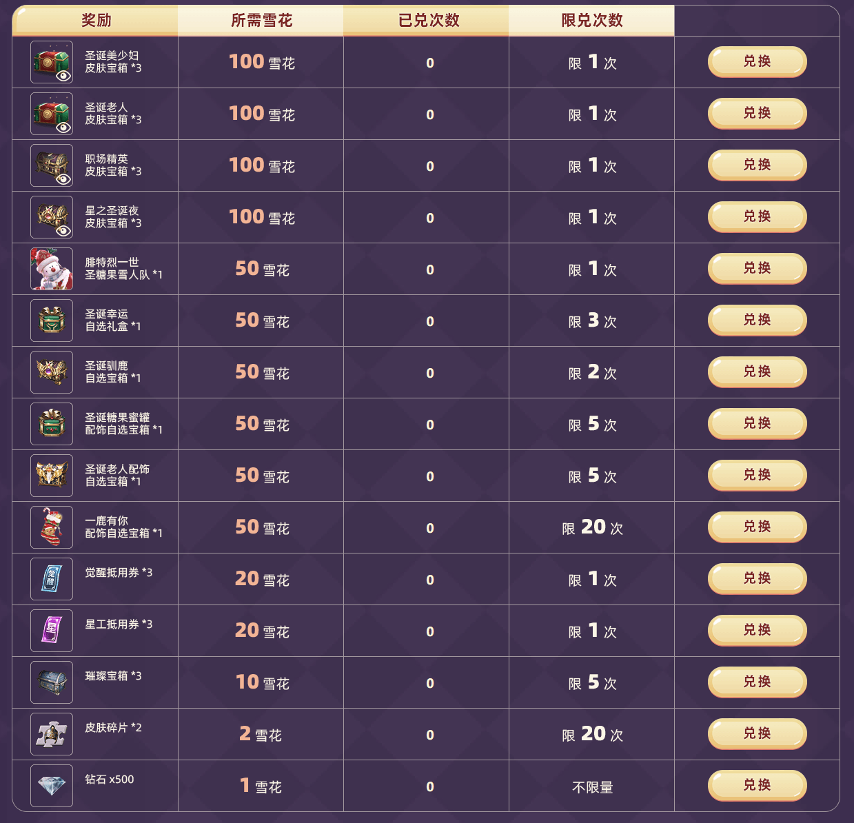 收集积攒雪花后,可在页面下方兑换丰厚奖励,包含历年圣诞皮肤、圣糖果雪人队兵皮、圣诞驯鹿坐骑、各类圣诞配饰、觉醒抵用券等奖励。种类多样丰富,绝对不容错过,错过再等一年!