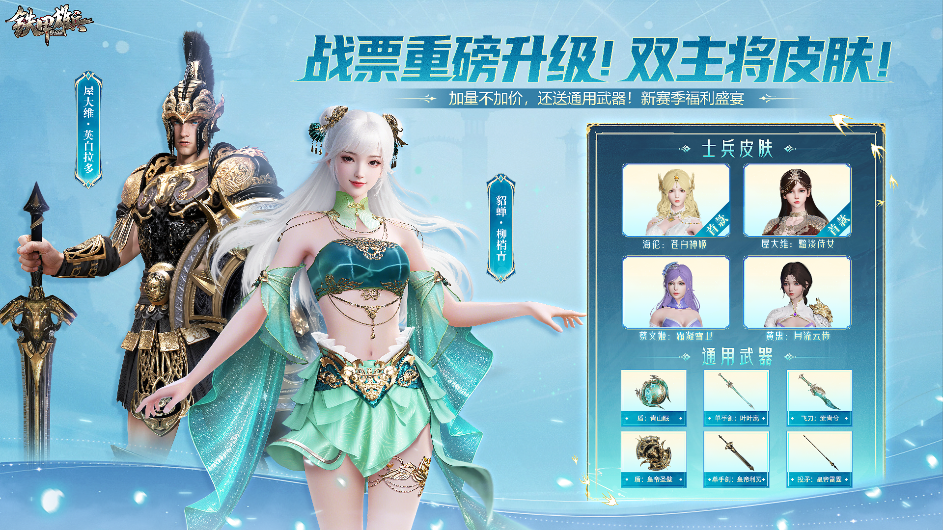 屋大维、貂蝉双主将皮肤,还有海伦等六款珍稀兵皮,超多战票豪礼不容错过!新赛季将于1月22日正式上线,诸位君主务必记得呼朋唤友,前来体验哦!