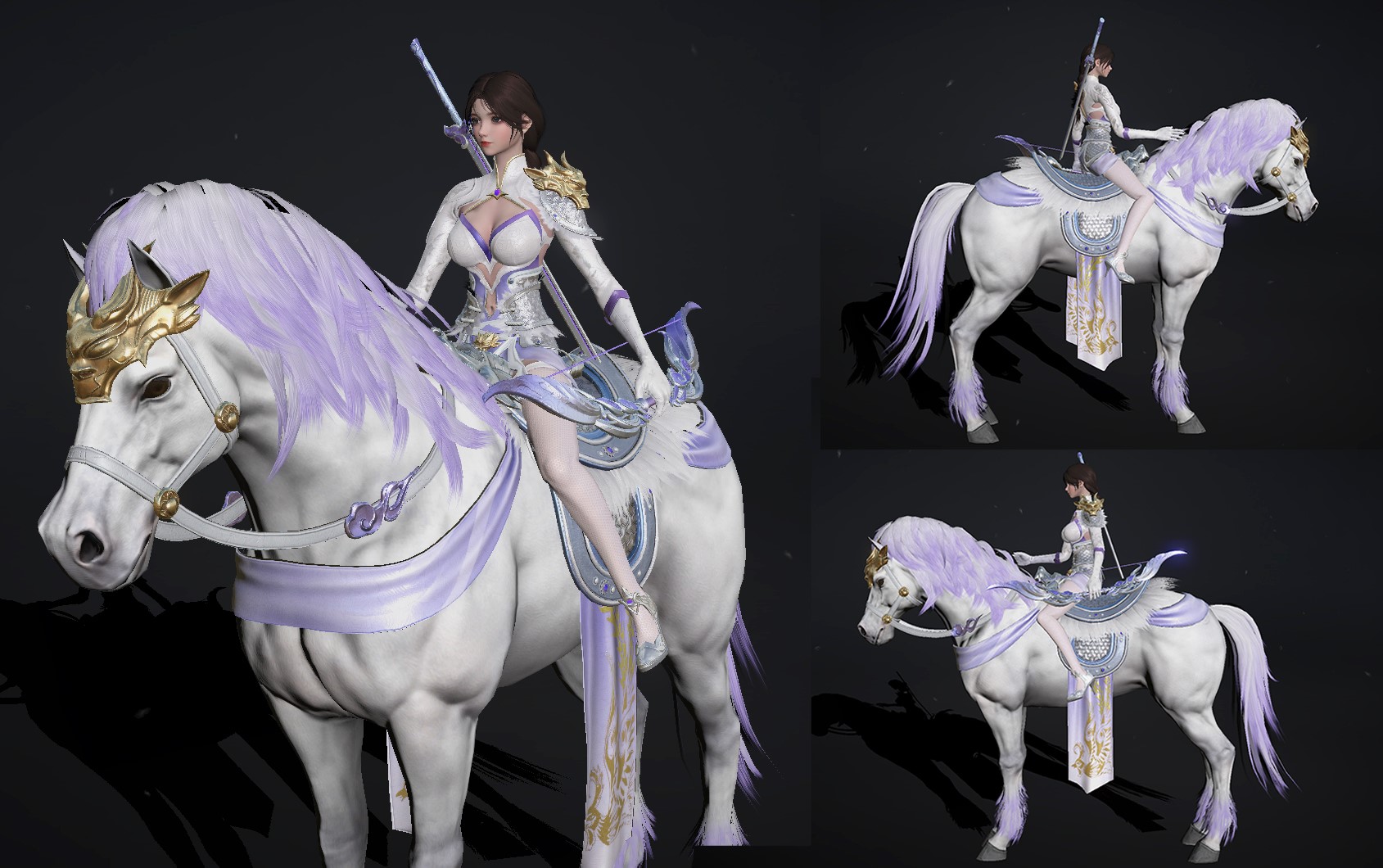 蔡文姬:霜凝雪卫。浑身高洁清丽,淡紫长裙优雅温婉,紫色长发秀丽动人。她们手持轻巧长剑与缀花圆盾,又透出飒爽的凛冽锋芒,仿佛是从书卷里走出的战场守护者。