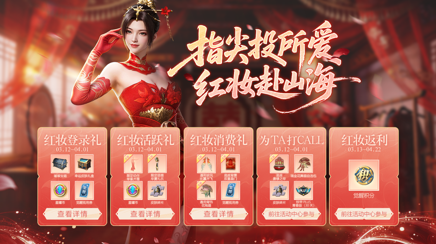 指尖投所爱,红妆赴山海。三月六大活动介绍完毕,限定披风、底座、背景等福利就等你来!3月12日,君主们不见不散哦!