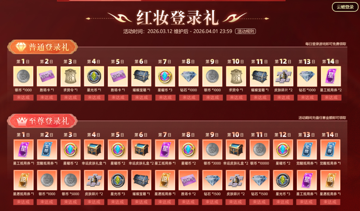 3月12日—4月1日活动期间,各位君主每日登录游戏即可免费领取璀璨宝箱、皮肤碎片等福利,连续14天畅领!活动期间充值任意金额,即可升级至尊登录礼,领觉醒皮肤券等奖励!