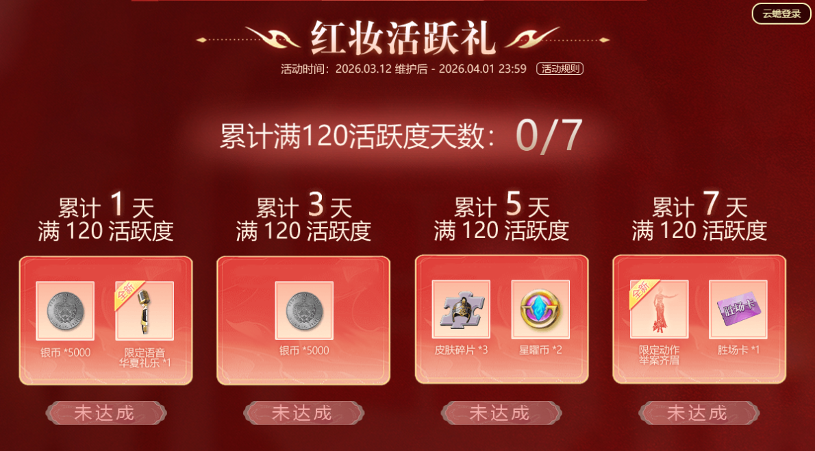 3月12日—4月1日活动期间,各位君主可通过完成每日任务积累活跃度,当满120活跃度分别累计达1/3/5/7天,可获得对应福利。