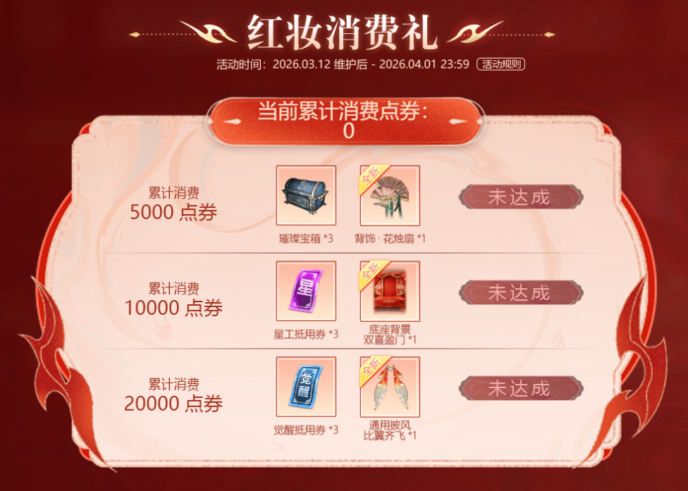 3月12日—4月1日活动期间,各位君主累计消费达到对应额度,便可直接领取专属赠礼,获得全新背饰【花烛扇】、底座背景【双喜盈门】、通用披风【比翼双飞】。