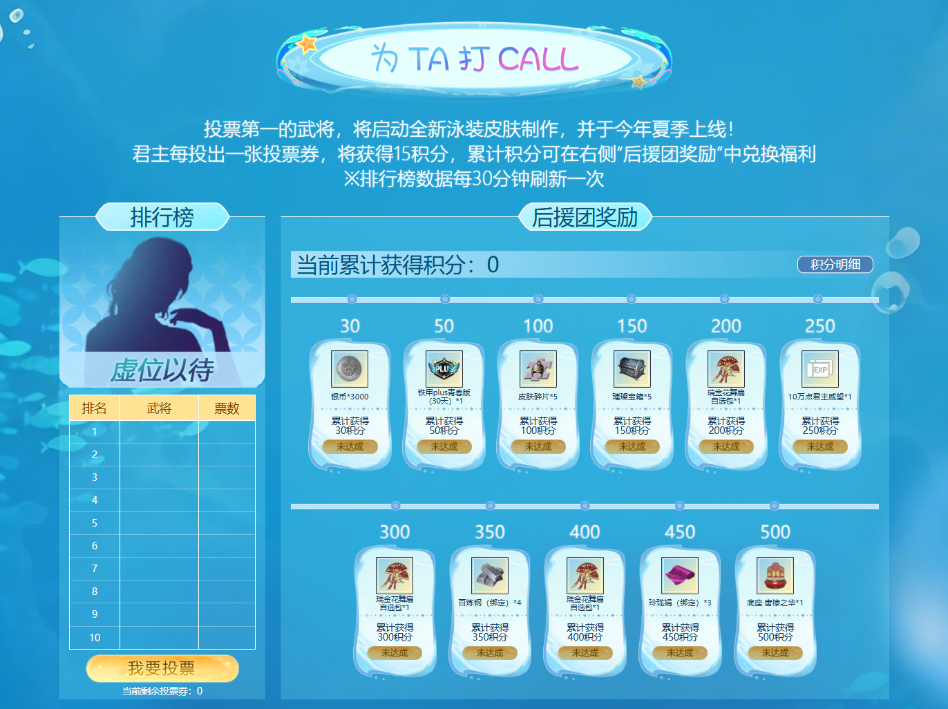 冬尽春来,春去夏至。喜欢泳装皮肤的君主们,千万不要错过这次活动喽,为自己喜欢的武将投票,在活动结束时,票数第一的武将会启动今年夏日全新泳装皮肤制作!