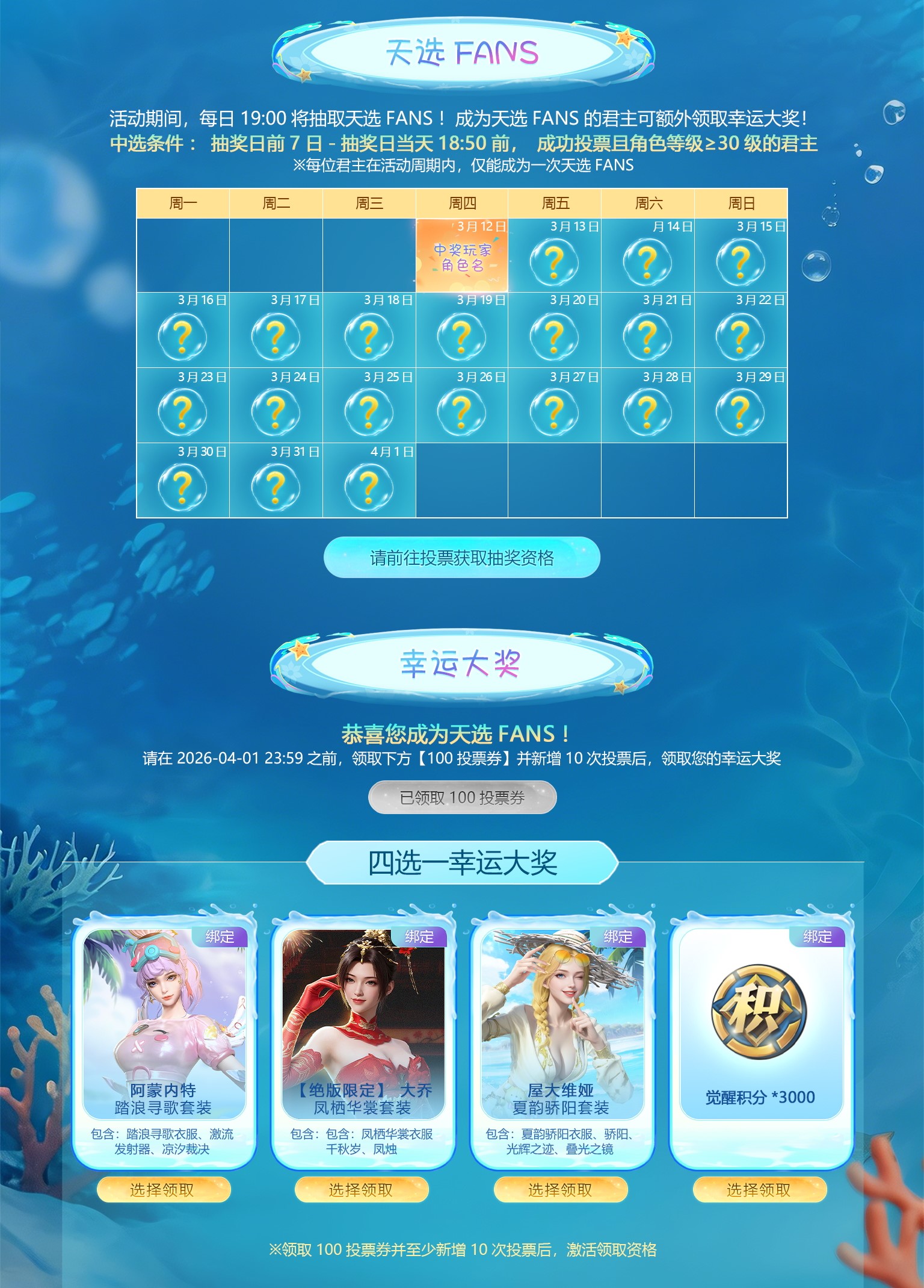 惊喜还未结束,3月12日—4月1日活动期间,在打call活动中成功投票且角色等级≥30级的君主,还有机会额外领取幸运大奖!