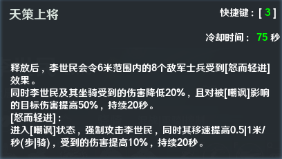 1、嘲讽扰敌:李世民释放3技能【天策上将】后,会令一定范围内的敌军士兵受到[怒而轻进]效果,李世民及坐骑受到伤害降低,且对被[嘲讽]目标的伤害提高。