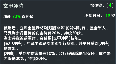 技能4【玄甲冲阵】释放后,立即重置武将Q技能[冲阵]的冷却时间,且一定时间内全军人、马受到步行目标的伤害降低。当士兵靠近敌军时,会使用[玄甲冲阵]技能。