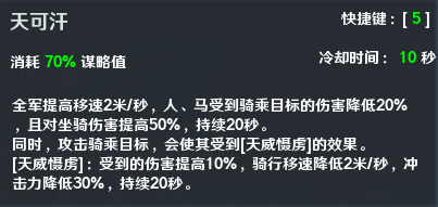 3、驱赶轻骑:使用5技能【天可汗】后,全军移速提高,人马受到骑乘目标的伤害降低,且对坐骑伤害提高。