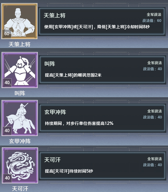李世民专属战法含金色【天策上将】、紫色【叫阵】、【玄甲冲阵】、【天可汗】。效果如下: